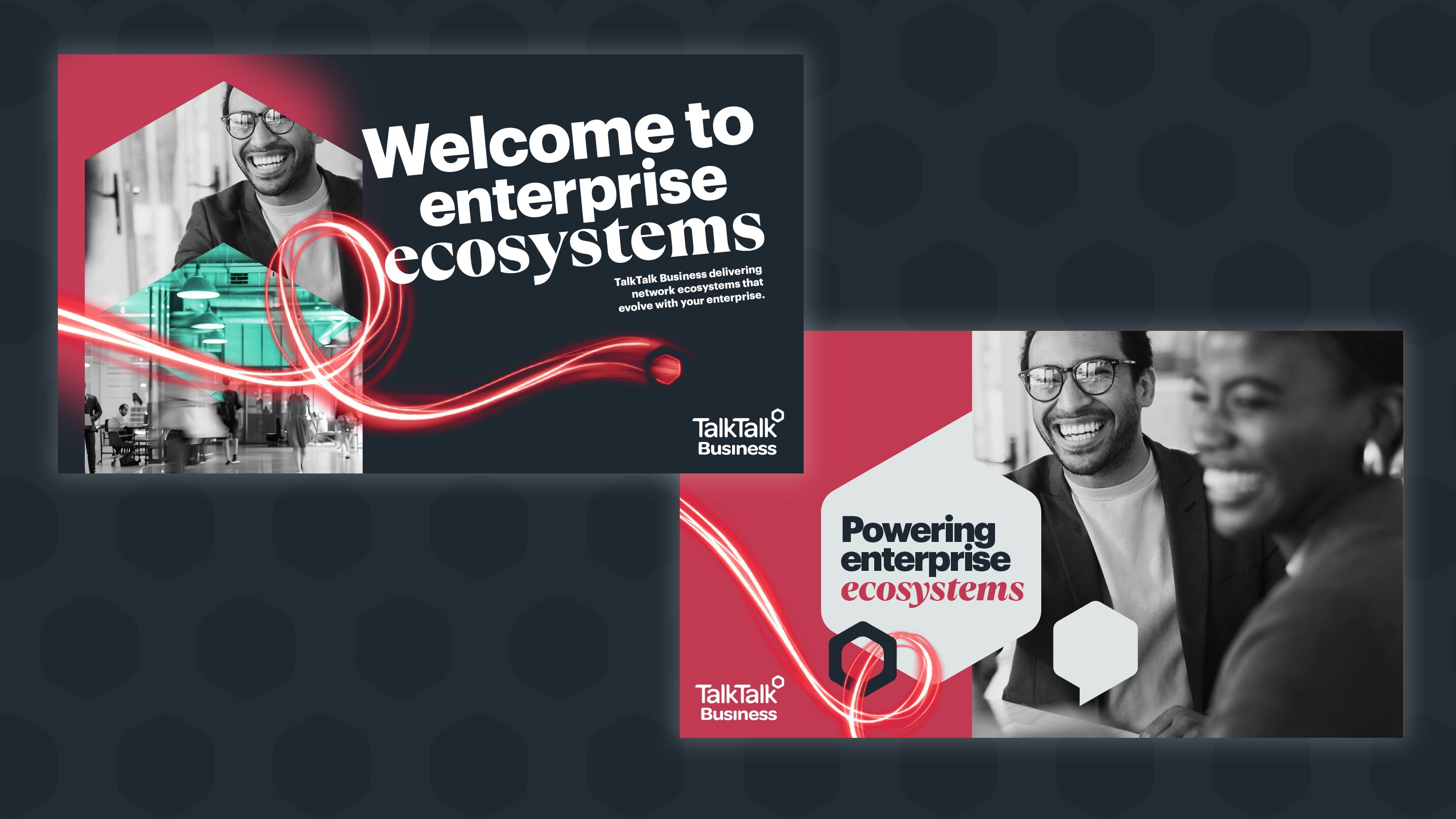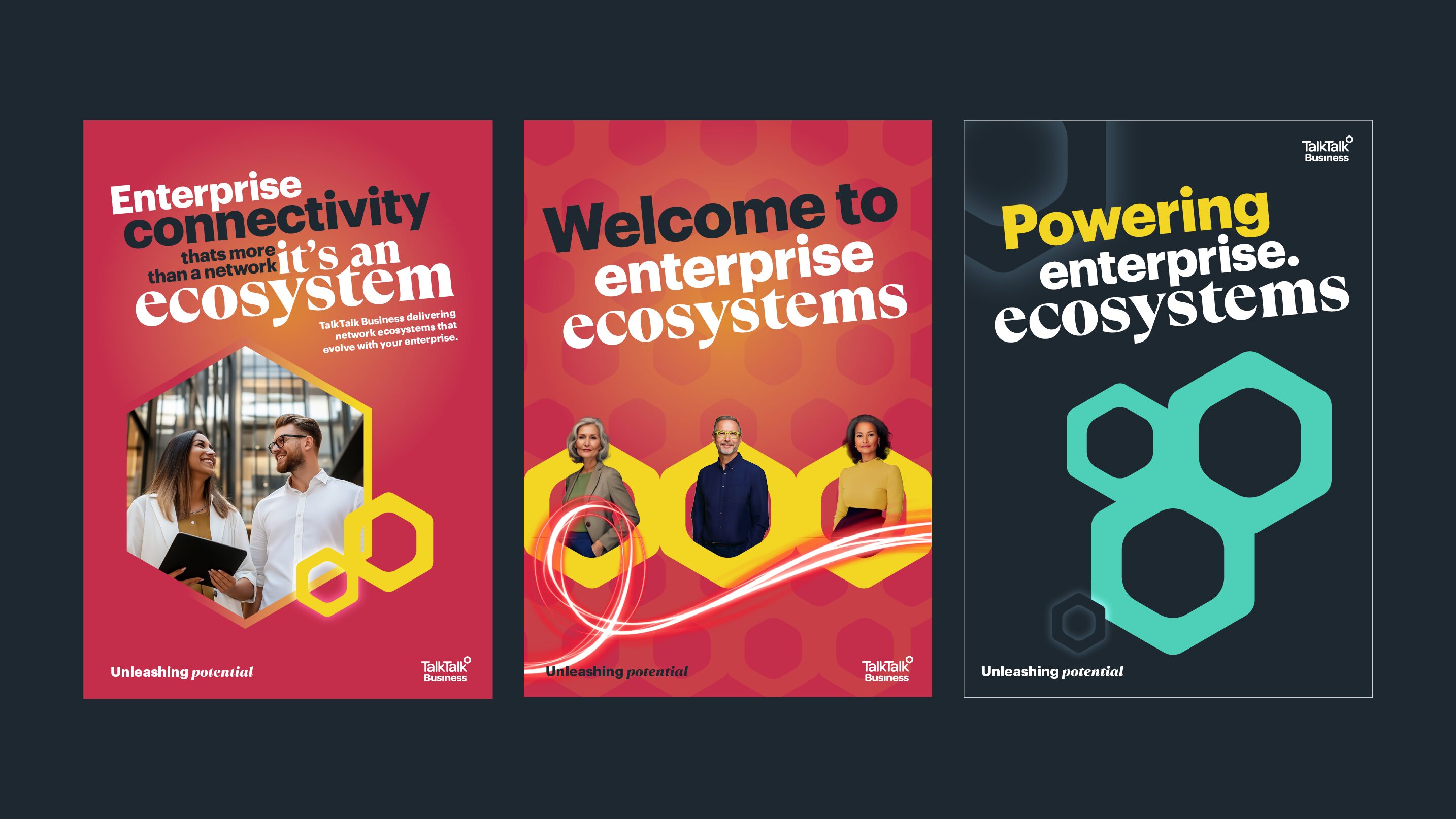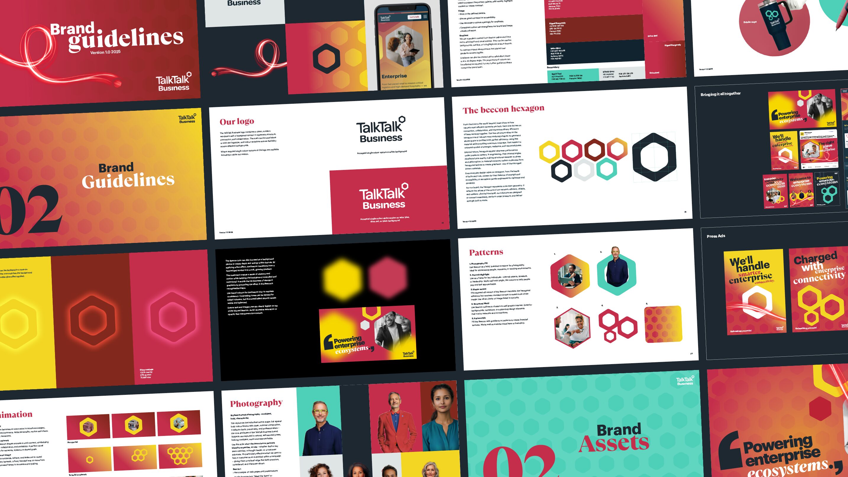 Then we codified the look: logo usage, colour palette, typography and distinctive brand assets such as the hive-inspired ‘Beecon’ hexagon. The latter conjures connection, resilience and tirelessness – a visual shorthand for how TalkTalk Business works.