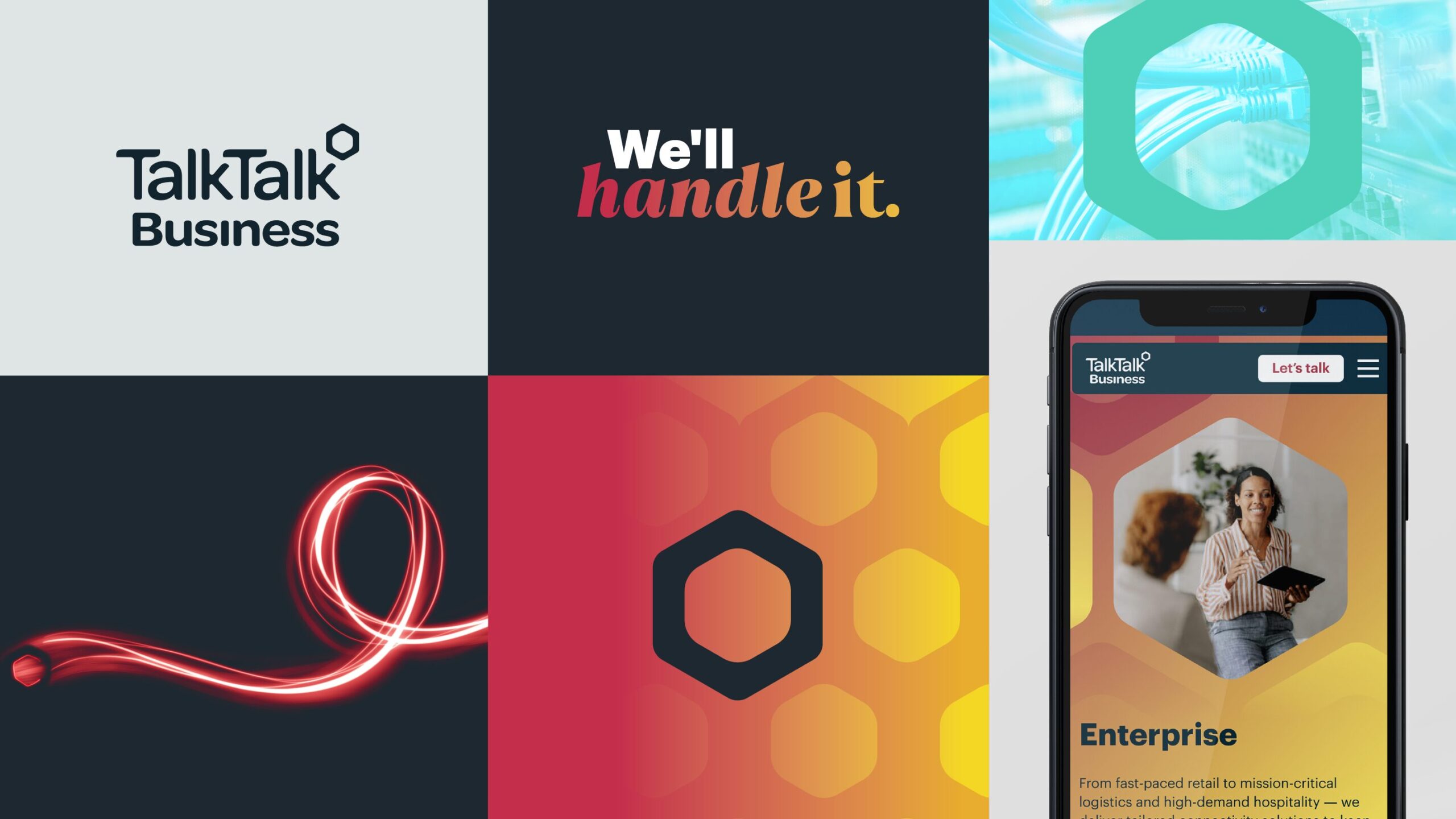 Then we codified the look: logo usage, colour palette, typography and distinctive brand assets such as the hive-inspired ‘Beecon’ hexagon. The latter conjures connection, resilience and tirelessness – a visual shorthand for how TalkTalk Business works.